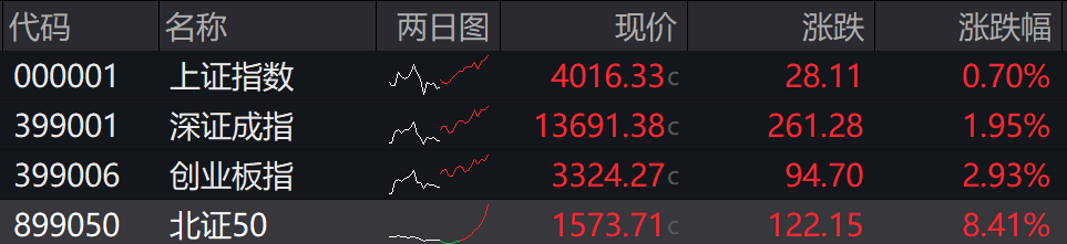 10月29日,A股三大指数小幅高开后震荡上行,截至收盘,沪指涨0.7%,再度站上4000点,创反弹新高;深证成指涨1.95%,创业板指涨2.93%。北证50大涨逾8%。