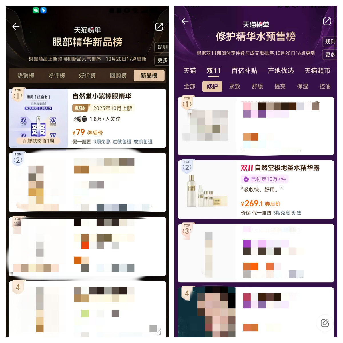 在此背景下,自然堂集团成为今年双十一大促中一道引人注目的风景线:其旗下多个品牌在预售阶段即稳居天猫、京东国货榜单前列,10月推出的自然堂小紫棒眼精华荣登天猫眼部精华新品榜NO.1,自然堂极地圣水精华露位列修护精华水预售榜NO.2,珀芙研冷膜、屏安精华等产品在天猫面膜预售榜、抖音美容护肤新品榜中名列前茅。美素多款产品也登上抖音好评榜、双11好物榜等榜单,展现出极强的用户粘性与私域运营能力。