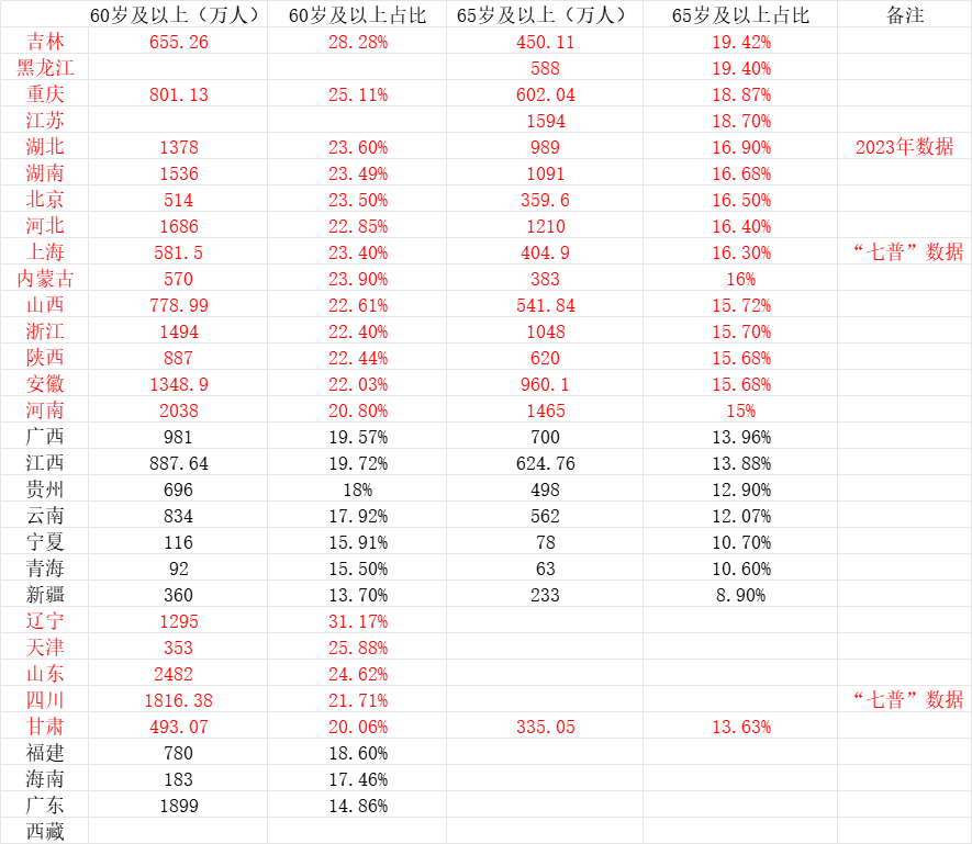 其实,梳理各省份2024年的统计公报及其他渠道发布的官方数据来看,目前,全国已经有20个省份进入了中度老龄化阶段。