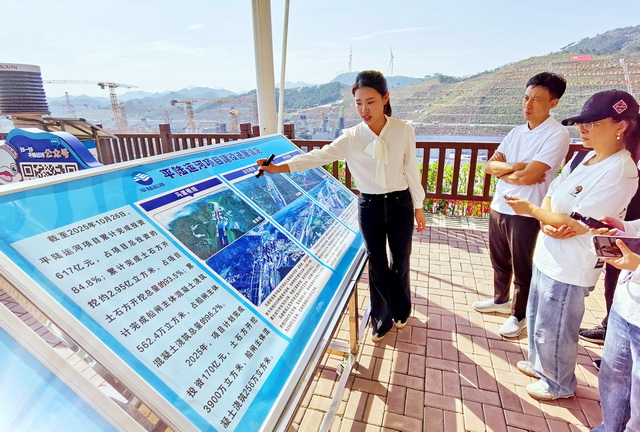 10月28日,广西钦州市灵山县平陆运河马道枢纽工程现场,工作人员在介绍工程建设情况。摄影/章轲