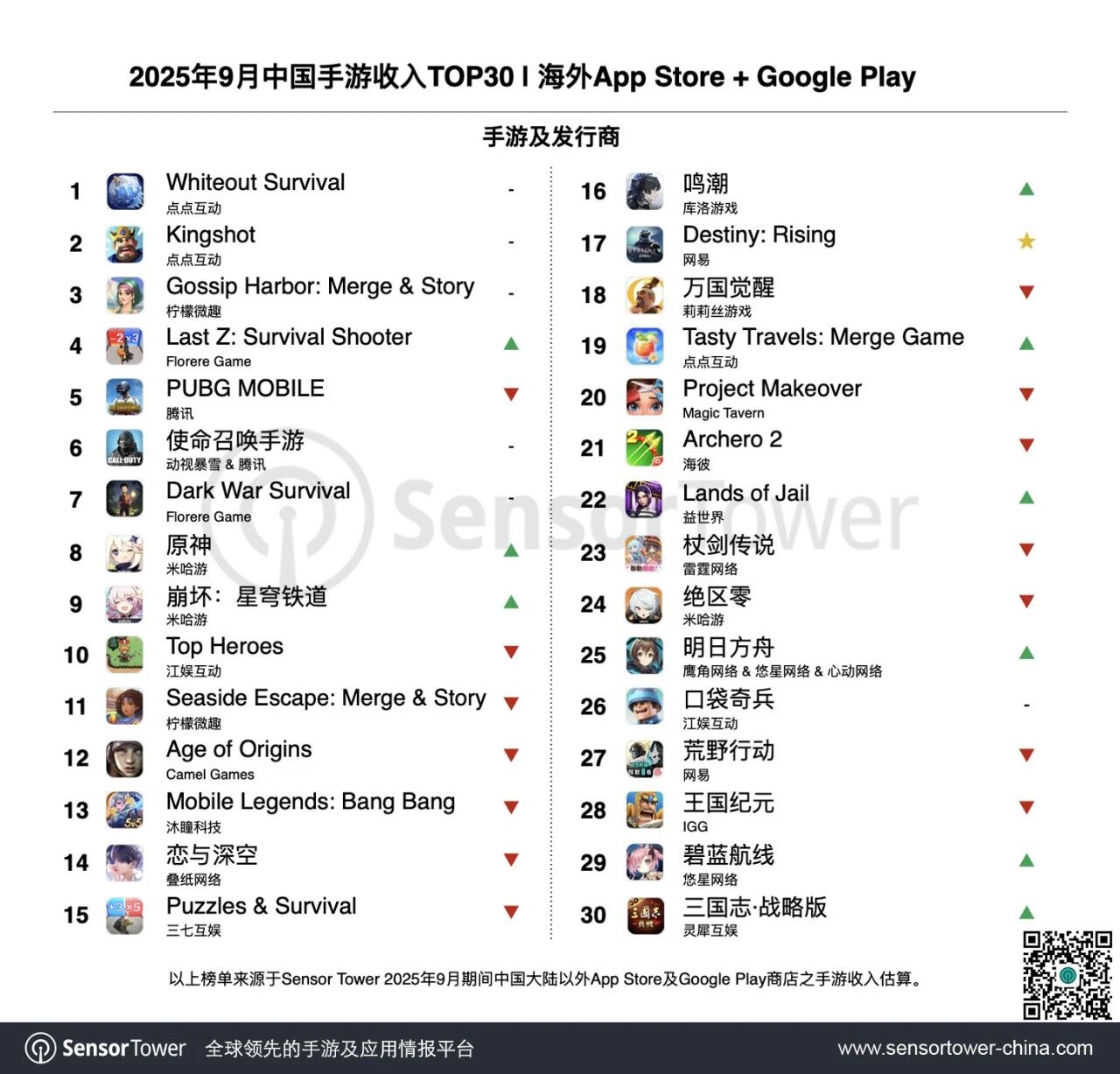 支撑世纪华通业绩的是两款出海爆款游戏——旗下点点互动的《Whiteout Survival》与《Kingshot》。根据SensorTower的报告,《Whiteout Survival》连续15个月位列中国手游出海收入榜榜首,截至今年9月,该游戏全球累计收入突破35亿美元(约为人民币249亿元),《Kingshot》是后起之秀,位列9月出海收入榜亚军,自2月上线以来全球累计收入已超4亿美元(约为人民币28亿元)。