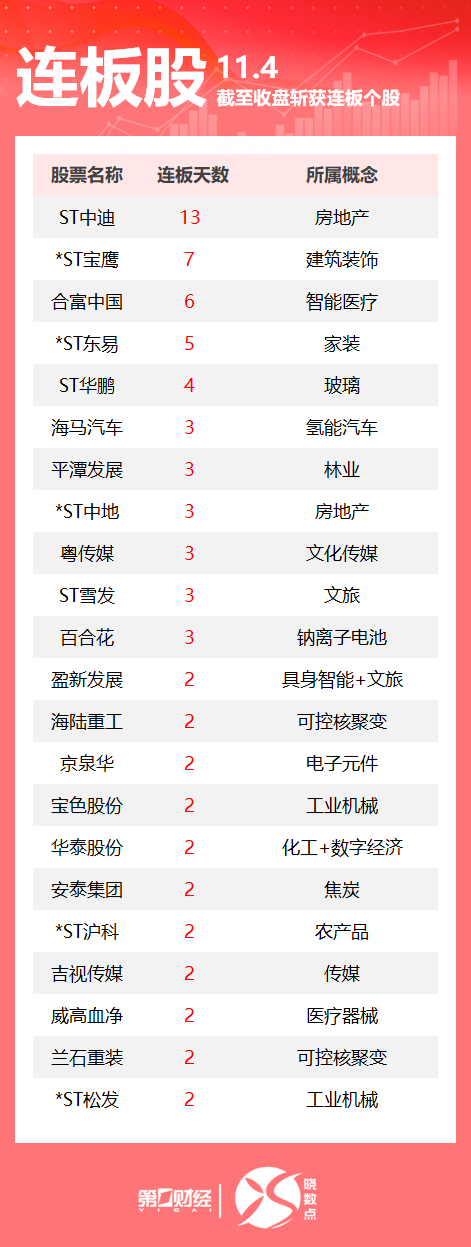 11月4日,Wind数据显示,A股市场共计68只个股涨停。其中医疗股合富中国收获6连板,可控核聚变板块海陆重工2连板。一图速览今日连板股>>