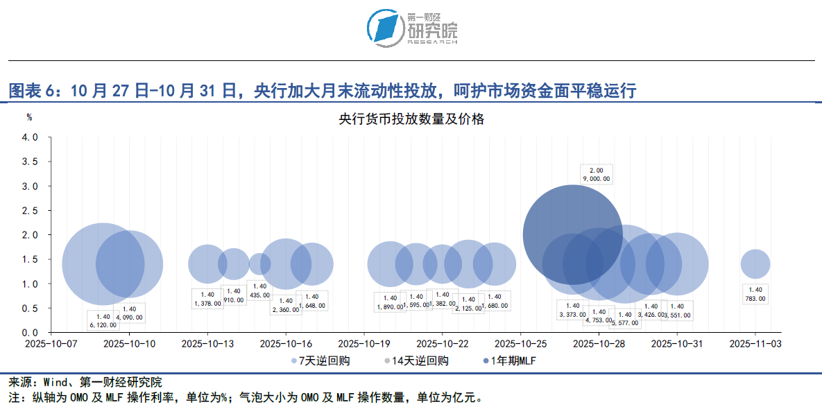 10月最后一周,央行扩大流动性投放以呵护市场资金面平稳运行。在10月27日至31日当周,央行共通过7天逆回购投放资金2.07万亿元,共有8672亿元逆回购到期,净投放资金1.2万亿元。