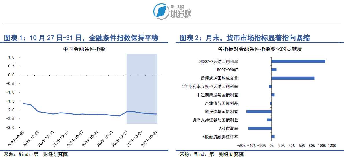 在2025年10月27日至31日当周,第一财经研究院中国金融条件日度指数均值为-2.17,较前一周上升0.05。从指数的分项指标来看,10月末市场流动性收紧,隔夜回购利率与7天回购利率明显上升,货币指标显著指向紧缩。从债券指标来看,信用债与国债之间的利差回落。从股市指标来看,A股市盈率持续上升带动金融条件趋向宽松。