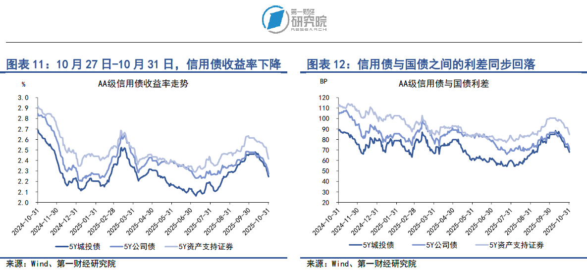 在10月27日至31日当周,多数品种信用债收益率明显下降。在AAA级债券中,5年期城投债、公司债和资产支持证券收益率分别下降8.9BP、6.95BP和9.36BP。在AA级债券中,5年期城投债、公司债和资产支持证券收益率分别下降8.82BP、9.16BP和8.81BP。