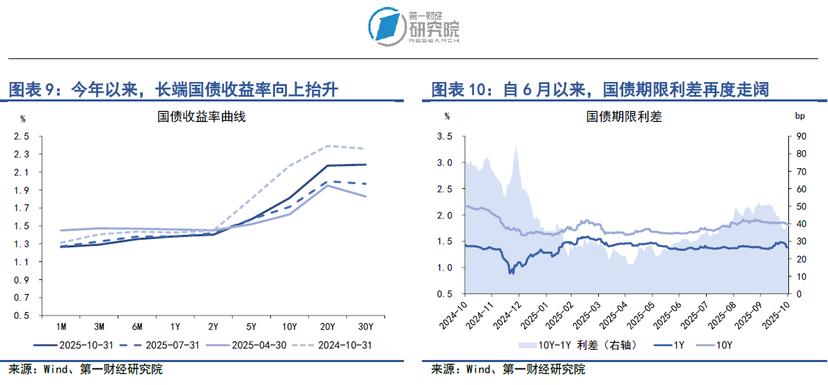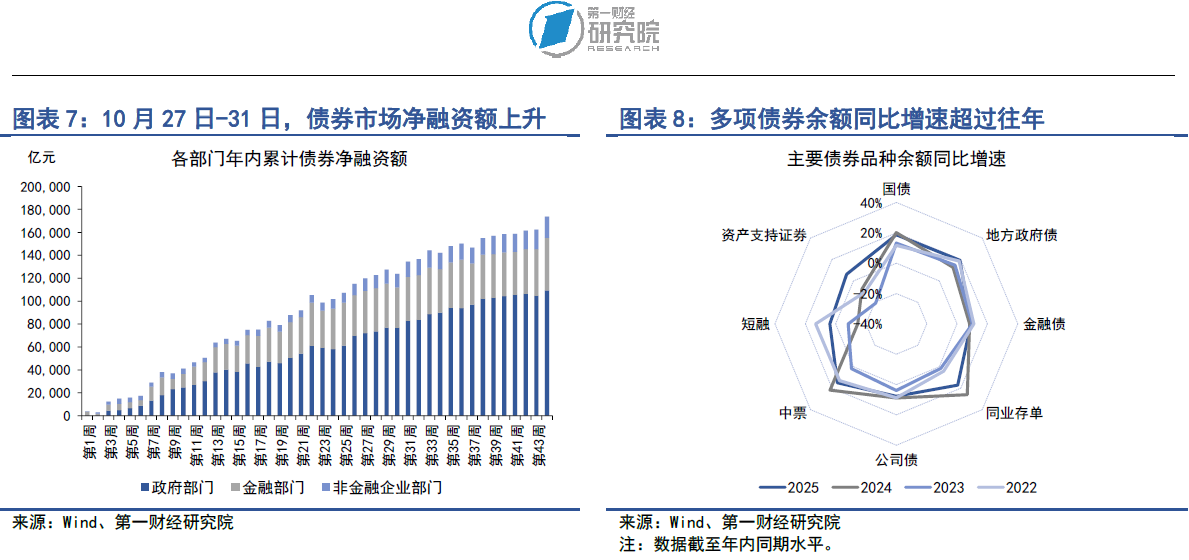 从债券余额增速来看,今年多项债券余额同比增速超过往年同期。截至10月31日,政府部门债券余额同比增速为19%,较2024年同期上升3.2个百分点;金融部门债券余额同比增速为11.6%,较2024年同期下降1.6个百分点;非金融企业部门债券余额同比增速为7%,较2024年同期增速上升0.9个百分点。