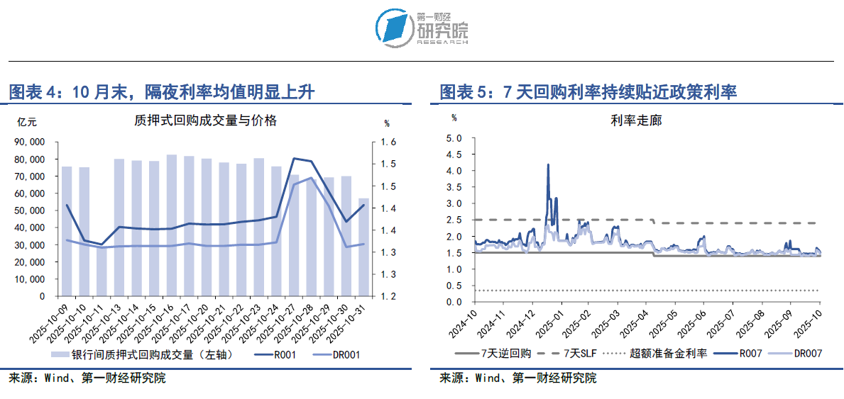 在10月27日至31日当周,月末银行间市场资金面较前一周收紧。从成交量来看,上周银行间质押式回购成交量均值为6.7万亿元,较前一周下降1.12万亿元。
