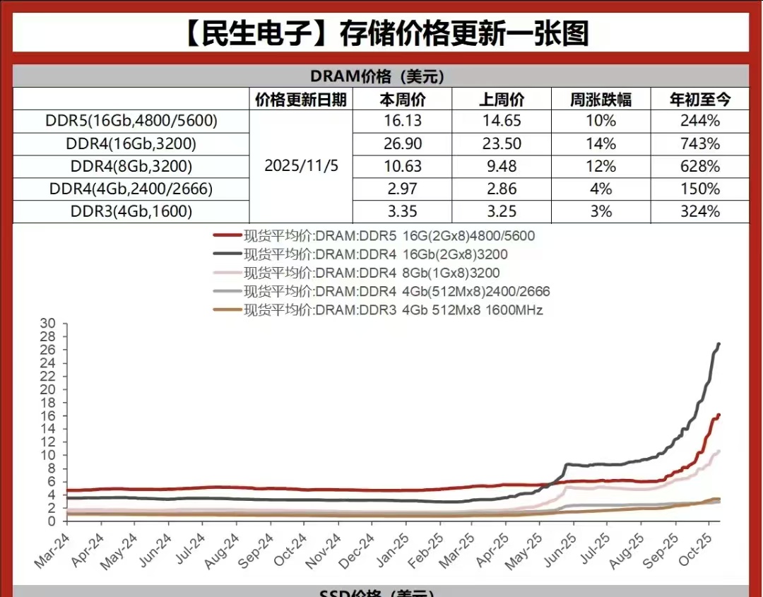 根据民生证券研究院整理的一份存储价格更新表,DDR4中4GB版本从年初到11月5日的涨幅为150%,而8GB和16GB版本的涨幅则高达628%和743%,近一周涨幅也普遍在10%以上。从价格看,DDR4的16BG的价格为26.90美元/颗,几乎是8GB的三倍。