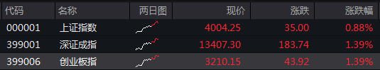 上证指数涨0.88%,重返4000点;深证成指涨1.39%,创业板指涨1.39%。