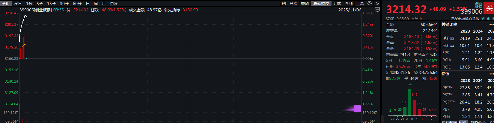09:35 创业板指日内涨超1%,突破3200点。