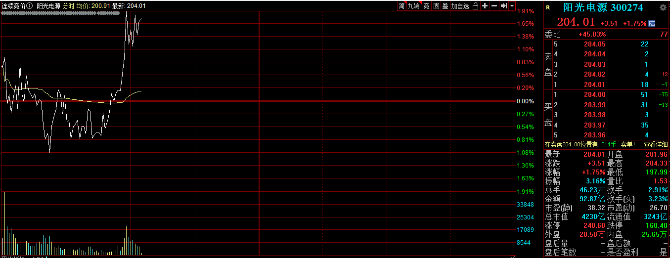 10:34 阳光电源盘中股价创历史新高,涨超1%,报204.01元。