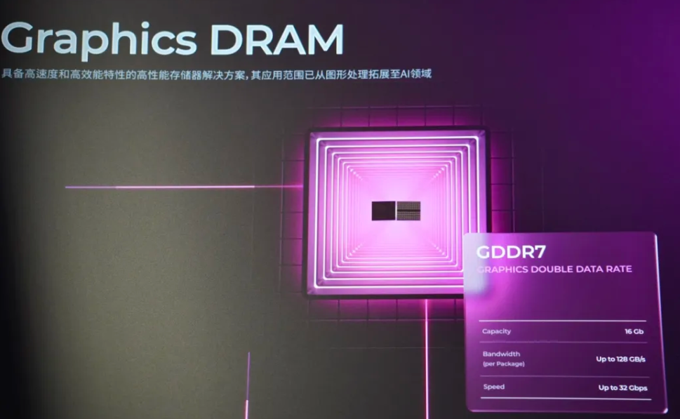 SK海力士带来了基于新一代PIM(Processing in Memory)技术解决方案的产品GDDR6-AiM、可满足服务器与数据中心多样化容量需求的产品eSSD、高性能服务器用DRAM模组Server DIMM、以及最新一代图形用DRAM产品GDDR7等产品。SK海力士工作人员现场重点介绍了GDDR7,相较于前一代,该产品可将运行速度提升60%、能效提升50%以上,属于全球领先的图形用DRAM。