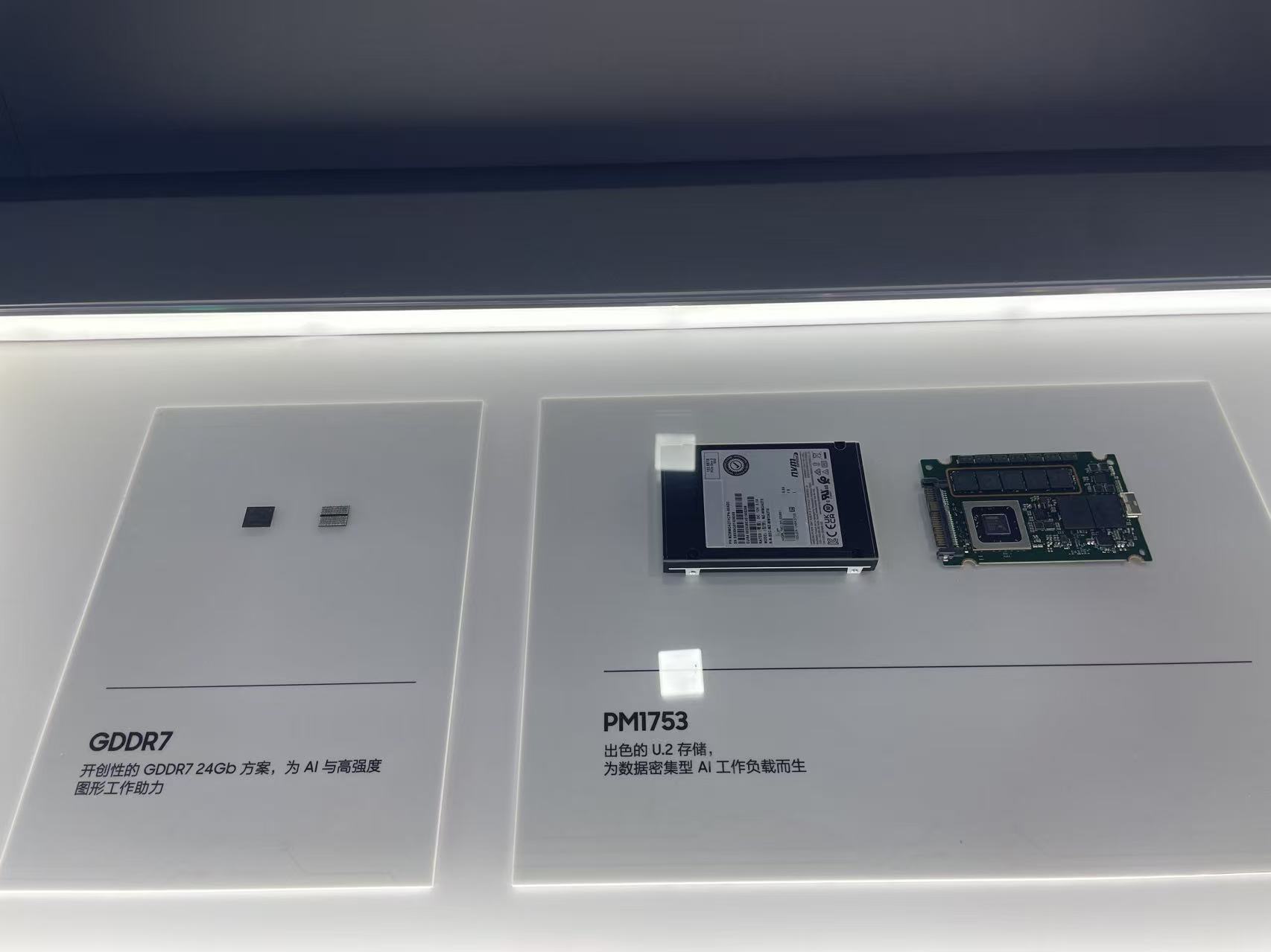 三星现场展示了为AI与高强度图形工作助力的GDDR7和为解决数据密集型AI负载存储的PM1753等产品。相比于现场消费端产品的展示面积,晶圆和存储业务的相关介绍所占面积并不大,但现场工作人员以展出的实物和模型为基础详尽地向观展人员介绍了从28nm到3nm相应工艺的区别和技术难点。