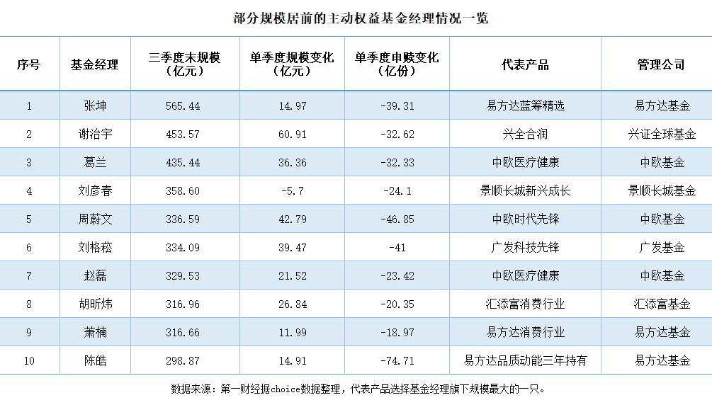 与此同时,多位顶流基金经理管理规模出现回升。易方达基金张坤以565.44亿元的管理规模稳坐头把交椅,单季度规模增长近15亿元;谢治宇、葛兰则分别以453.57亿元、435.44亿元重归“400亿+”梯队;周蔚文、刘格菘、汇添富基金胡昕炜等也悉数重返300亿阵营。