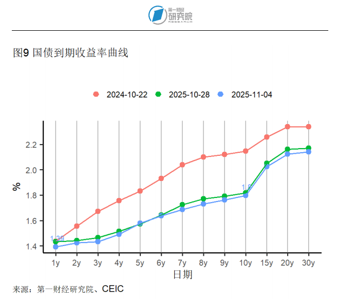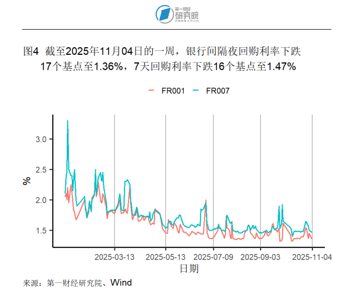 截至11月4日的银行间隔夜利率在过去一周下降17个基点至1.36%,在过去一个月下降26个基点,较去年同期下降14个基点。七天回购利率在过去一周下降16个基点至1.47%,在过去一个月下降18个基点,较去年同期下降31个基点。