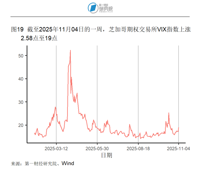 截至11月4日的一周,芝加哥期权交易所VIX指数上升2.58点至19点。标普大宗商品总指数在本周上升1.23%至3933.43。能源和农业指数分别上升2.31%和2.28%至641.81和494.63;工业金属指数则下降1.95%至1928.75。