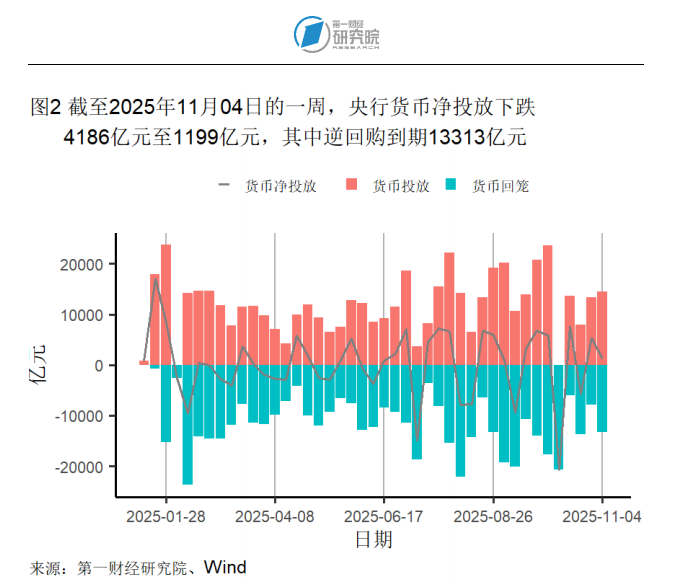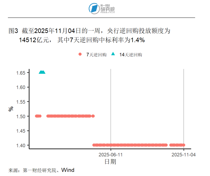 截至11月4日的一周,央行通过公开市场净投放资金1199亿元。本周,央行逆回购投放额度为14512亿元,逆回购到期13313亿元,7天逆回购中标利率为1.4%。