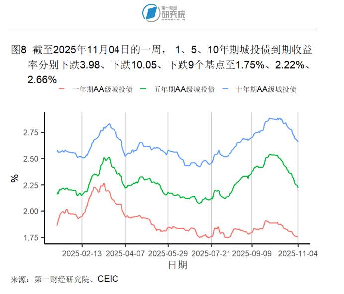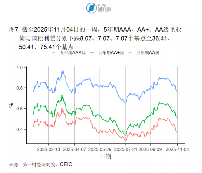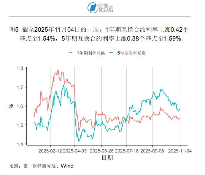 截至11月4日的1年期互换合约利率在过去一周上升1个基点至1.54%,较一个月前下降4个基点,较去年同期下降13个基点。5年期互换合约利率在过去一周上升1个基点至1.59%,较一个月前下降9个基点,较去年同期下降19个基点。