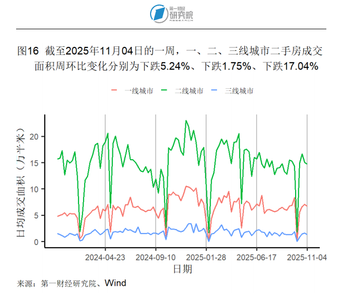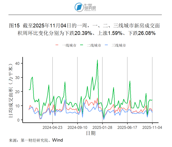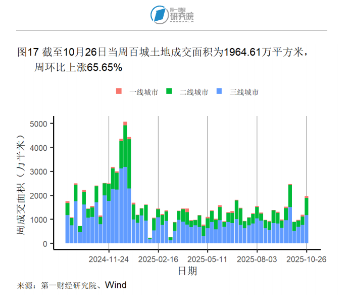 截至11月4日的一周中,新房方面,一线城市与三线城市新房成交面积分别环比下降20.39%和26.08%;二线城市新房成交面积则环比上升1.59%。二手房方面,一、二、三线城市二手房成交面积分别环比下降5.24%、1.75%和17.04%。本周,所有房屋日均成交面积均低于去年同期水平。截至10月26日的一周,百城土地成交面积为1964.61万平方米,周环比上升65.65%。