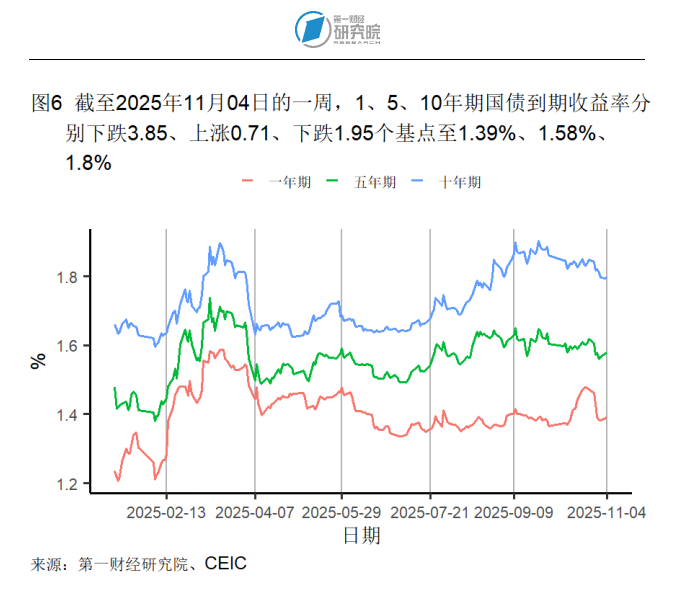 截至11月4日的一周,1年期和10年期国债到期收益率分别下降3.85和1.95个基点至1.39%和1.8%;5年期国债到期收益率则上升0.71个基点至1.58%。