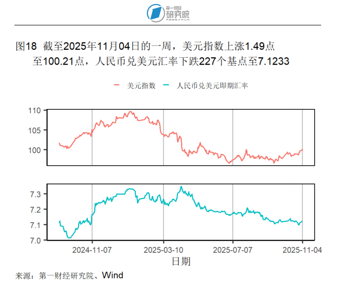高频数据显示,截至11月4日的一周,美元指数上升1.49点至100.21点;人民币对美元汇率下降227个基点至7.1233。