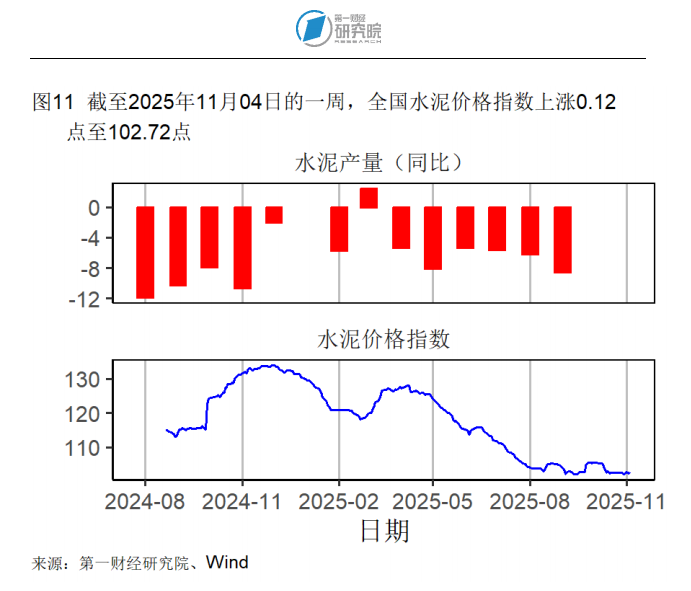 截至11月4日的钢坯价格在过去一周下降了1.68%,在过去一个月下降了0.68%,较去年同期下降了6.39%。水泥价格在截至11月4日的一周上升了0.12%,过去一个月下降了2.65%,较去年同期下降了22.28%。动力煤价格在过去一个月上升了1.18%,较去年同期下降了4.20%。