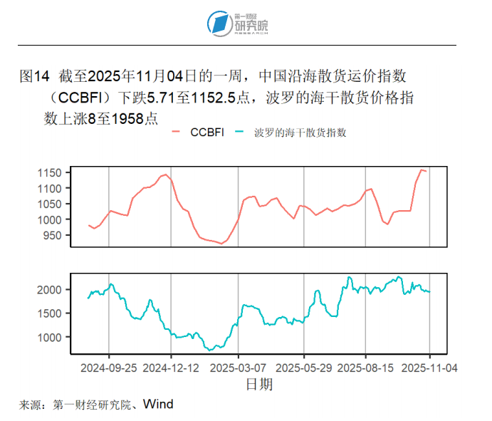 中国沿海散货运价指数(CCBFI)在截至11月4日的一周下降5.71点至1152.5点;波罗的海干散货价格指数上升8点至1958点。