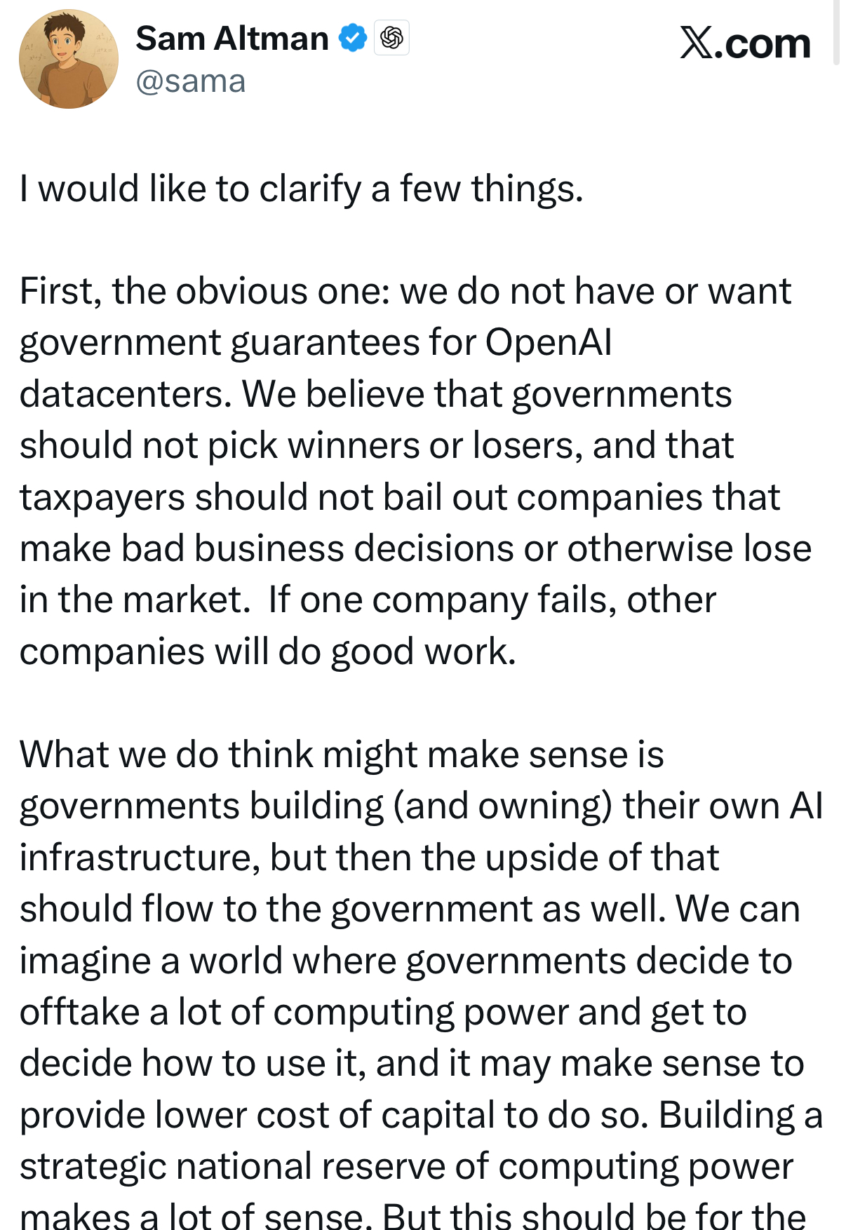 奥尔特曼也在7日凌晨紧急发文“救火” ,这一帖子全文近2000字,其中奥尔特曼称“不需要也不想要美国政府为OpenAI数据中心提供担保”。