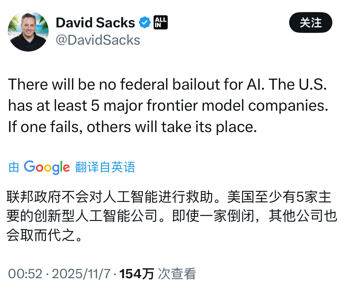 事件愈演愈烈后,美国政府的AI顾问David Sacks在社媒上回应称,美国至少有5家主要前沿AI模型公司,如果一家倒闭,其他公司将取而代之。