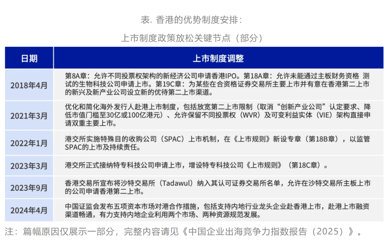 从全球价值链的角度看,香港在中国企业出海过程中占据了一个既连通内地又面向国际的独特节点位置。它不是生产制造的节点,也不是技术研发的节点,而是“金融”和“规则”的关键接口。这种定位使香港成为中国企业参与全球竞争的重要支撑。在地缘政治风险上升、贸易保护主义抬头的背景下,香港的国际化法律环境、专业服务体系和多元化投资者结构,为中国企业提供了重要的风险分散和资源配置功能。