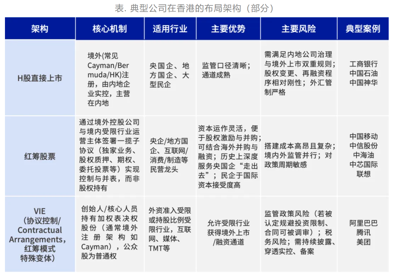 从具体的企业实践来看,中国出海领军企业在香港的架构设计充分体现了香港作为全球化枢纽的独特价值,而这种价值很大程度上源于香港对多元化上市架构的包容性和创新性,并且从2018年开始就不断调整、改革,为内地优质企业铺路。在香港市场上,中国企业可以根据自身的业务特点、发展阶段和战略需求,选择最适合的上市架构。典型公司在香港的布局架构部分如下表所示。