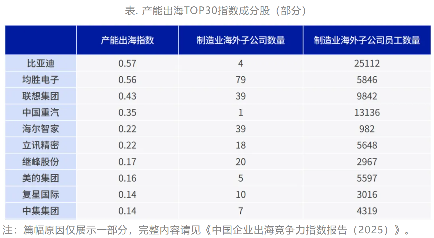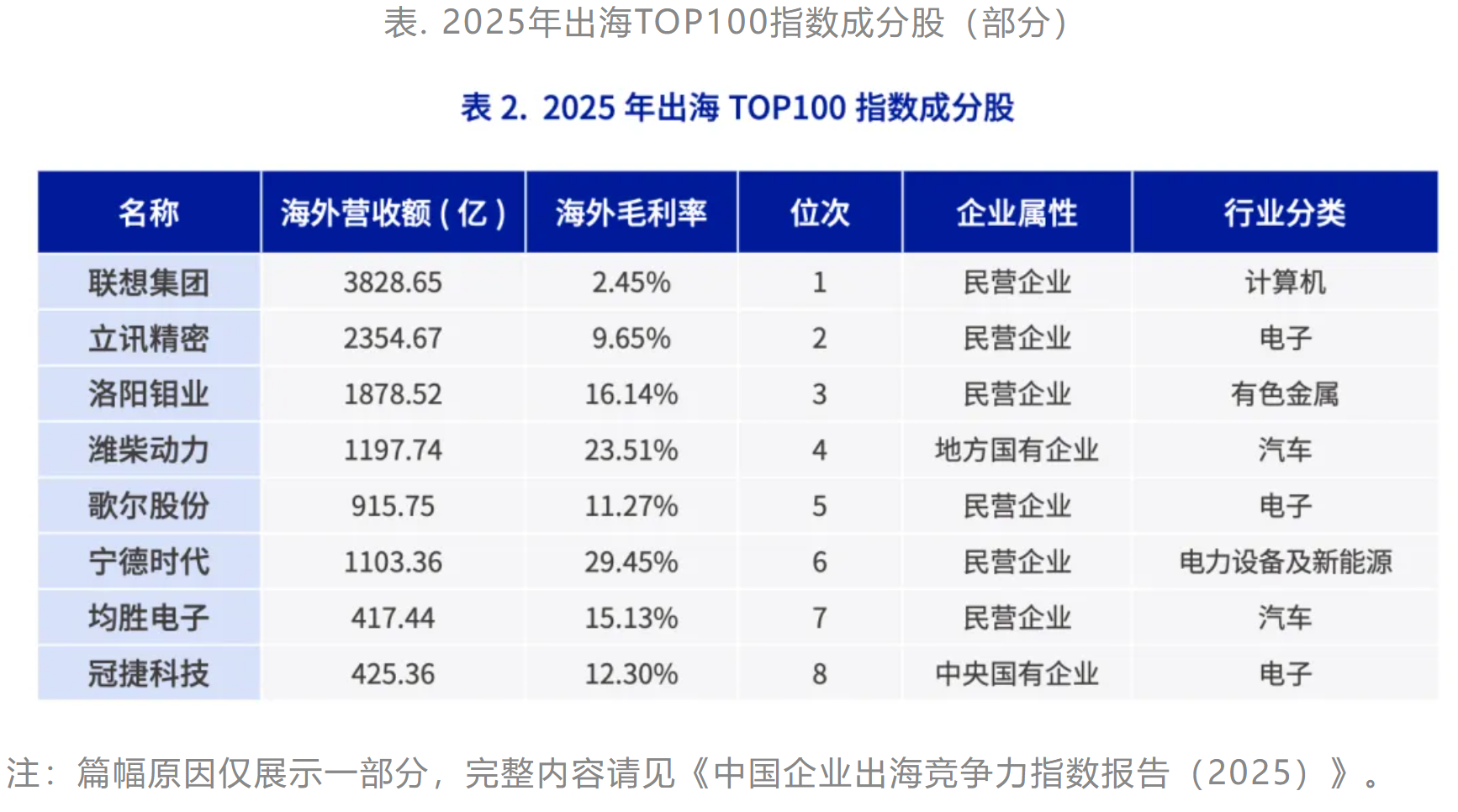 下表是我们筛选出的前100家能够代表中国出海的领军者(截图为其中一部分企业,完整表单请见《中国企业出海竞争力指数报告(2025)》。