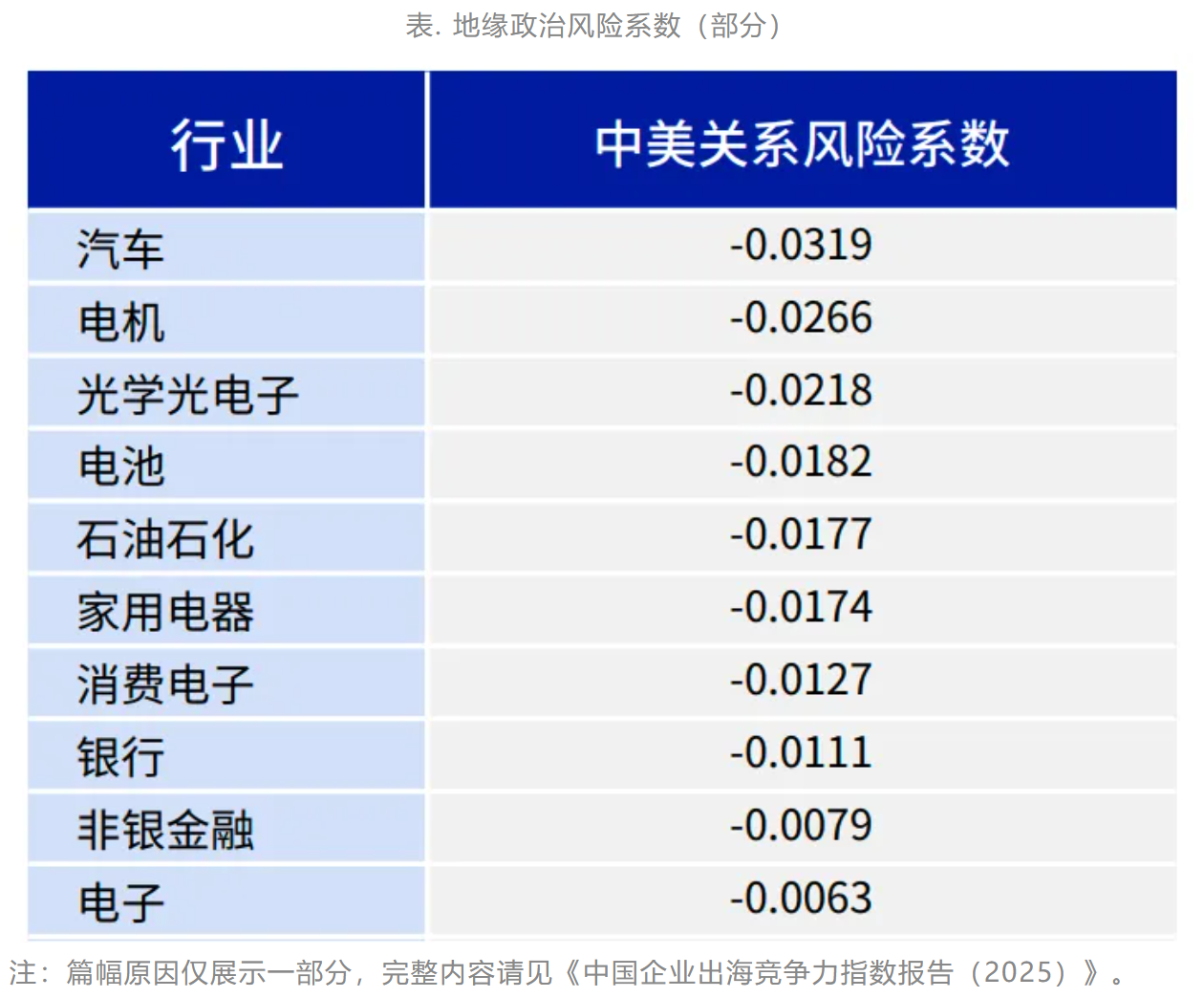 在下表,我们列出了31个大类及部分细分行业所面临的地缘政治风险系数(以中美关系紧张度为衡量标准)。从数据上看,汽车、石油石化、家用电器以及金融业受中美关系紧张度的影响程度更高。