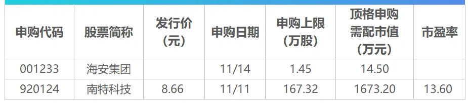Wind数据显示,本周将有2只新股发行。具体来看,11月11日发行的是南特科技,申购代码为920124;11月14日发行的是海安集团,申购代码为001233。