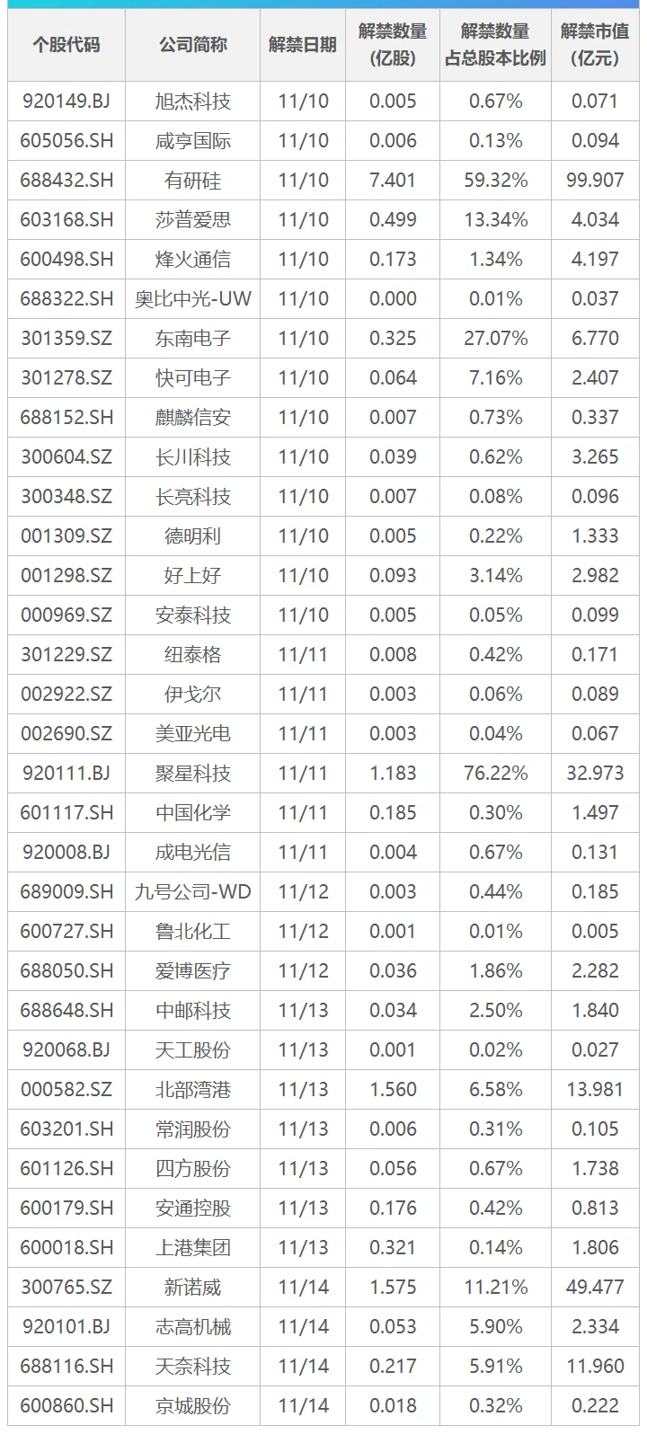 Wind数据统计显示,本周将有34家公司限售股陆续解禁,按照最新收盘价计算,合计解禁市值逾247亿元。从解禁市值来看,11月10日是解禁高峰期。按最新收盘价计算,解禁市值居前三位的是:有研硅(99.91亿元)、新诺威(49.48亿元)、聚星科技(32.97亿元)。从个股的解禁量看,解禁股数居前三位的是:有研硅(7.4亿股)、新诺威(1.58亿股)、北部湾港(1.56亿股)。