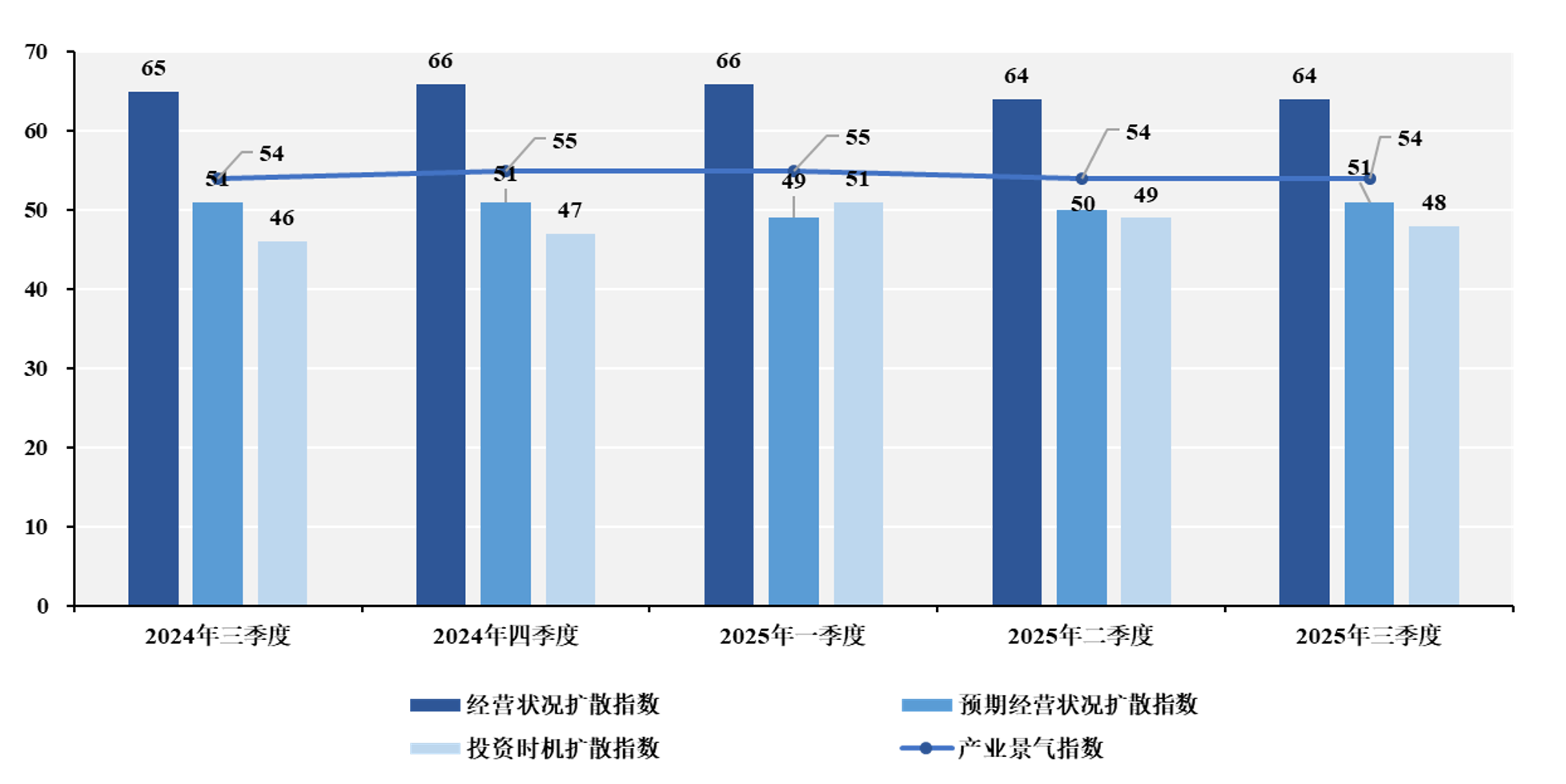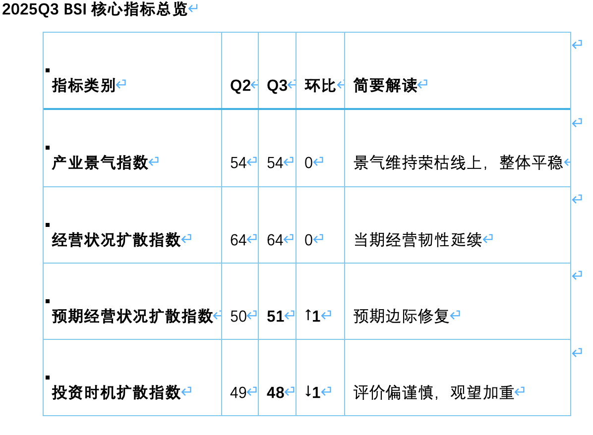 长江商学院最新发布的BSI(中国产业经济景气指数)显示:三季度产业景气指数54,与上季持平;经营状况扩散指数64,与上季持平;预期经营状况扩散指数升至51(+1);投资时机扩散指数48(-1)。评价层面趋谨慎,但生产与库存出现“备货式修复”,呈现“评价谨慎、行为修复”的张力。