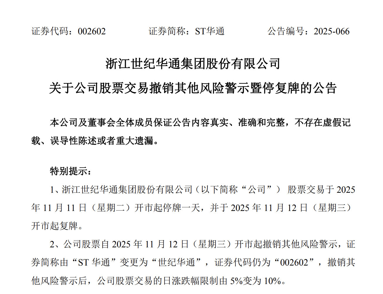 根据深交所规定,世纪华通将于11月11日停牌1天,11月12日开市起复牌并撤销其他风险警示,股票简称将由“ST华通”变更恢复为“世纪华通”,证券代码仍为“002602”。撤销其他风险警示后,公司股票交易的日涨跌幅限制由5%变为10%。