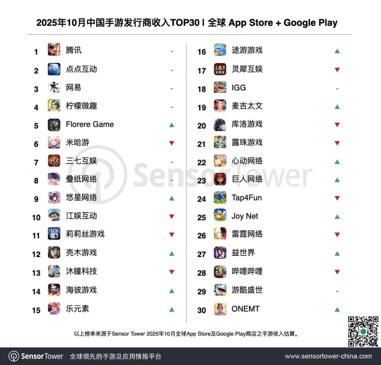 根据SensorTower 11月7日发布的《2025年10月中国手游发行商全球收入排行榜》,点点互动收入继续超过网易,位列第二位,仅次于腾讯。