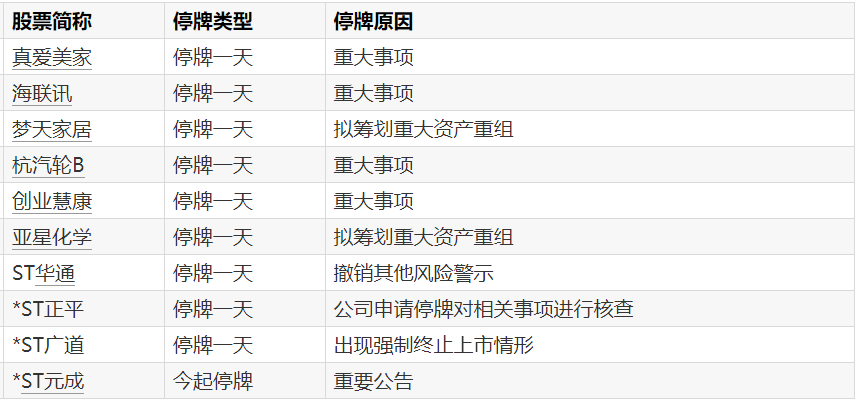 Wind数据显示,11月11日,真爱美家、海联讯、梦天家居等10只个股停牌。