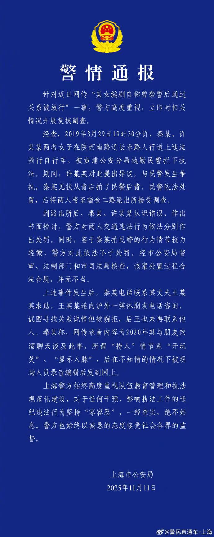 11月11日,针对近日网传“某女编剧自称曾袭警后通过关系被放行”一事,上海市公安局发布警情通报,详情如下: