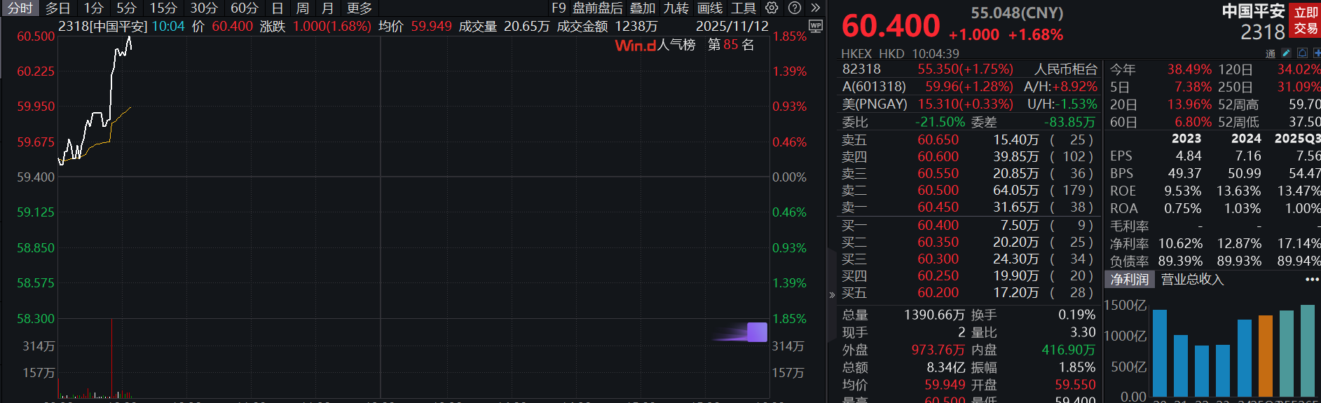 10:04 中国平安港股突破60港元,创2021年8月以来新高。