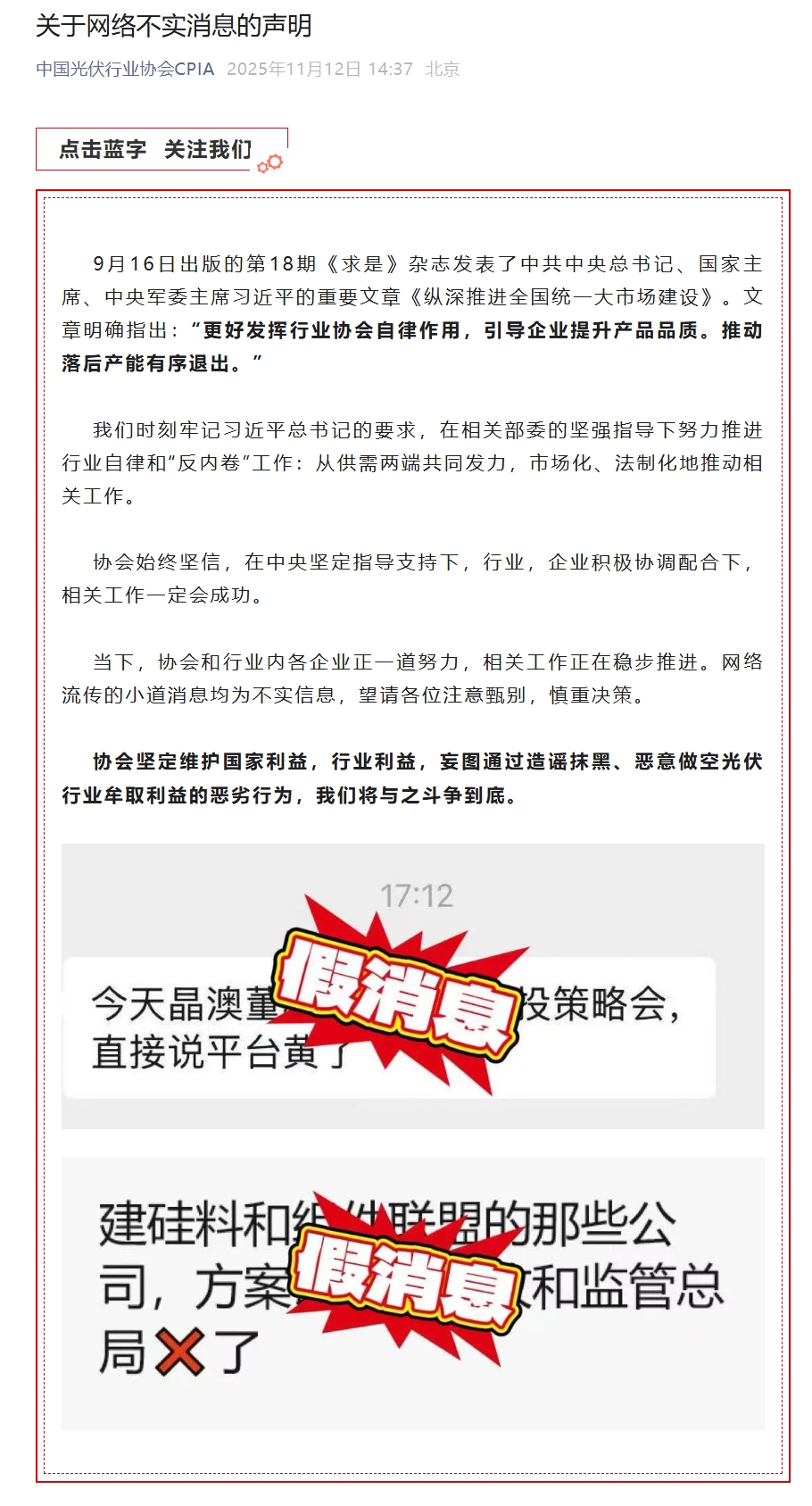中国光伏行业协会发布关于网络不实消息的声明。声明称,中国光伏行业协会在相关部委的坚强指导下努力推进行业自律和“反内卷”工作:从供需两端共同发力,市场化、法制化地推动相关工作。当下,协会和行业内各企业正一道努力,相关工作正在稳步推进。网络流传的小道消息均为不实信息,望请各位注意甄别,慎重决策。协会坚定维护国家利益,行业利益,妄图通过造谣抹黑、恶意做空光伏行业牟取利益的恶劣行为,我们将与之斗争到底。