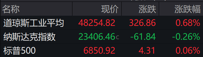 当地时间周三,美股涨跌互现,科技股继续承压。截至收盘,道指涨0.68%,再创历史新高,纳指跌0.26%,标普500指数涨0.06%。