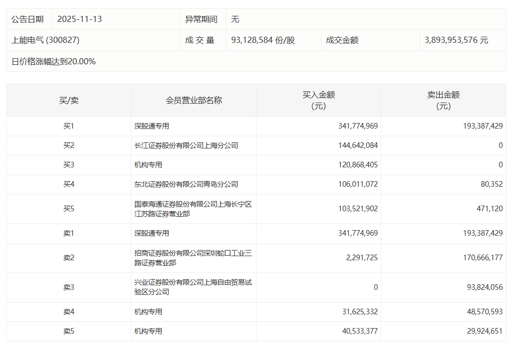 上能电气今日20cm涨停,2家机构专用席位净买入1.31亿元