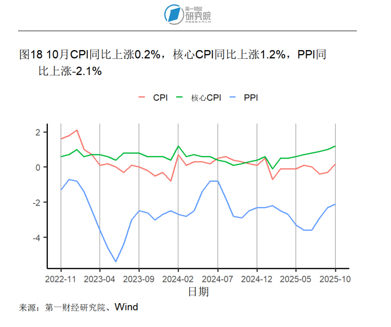 国家统计局公布10月物价数据。10月,CPI同比增长0.2%,增速高于上月0.5个百分点。其中,核心CPI同比增长1.2%,增速高于上月0.2个百分点,涨幅连续第6个月扩大;食品CPI同比降幅较上月缩小了1.5个百分点至2.9%,均是当月CPI同比回升的重要原因。具体看食品方面,鲜菜、猪肉、鲜果价格同比降幅分别较上月缩小了6.4、1.0和2.2个百分点至7.3%、16.0%和2.0%。此外,水产品价格在过去两个月同比增速均有所放缓的情况下,10月同比增长2.0%,增速回升了1.1个百分点。其他指标方面,10月,在假期的影响下,旅游价格同比增速高于上月1.2个百分点至2.1%。医疗保健方面,医疗服务价格同比增速连续7个月走高至2.4%。10月,金饰品及铂金饰品价格同比增速维持在高位,当月分别增长50.3%和46.1%。环比来看,10月CPI增长0.2%,增速高于上月0.1个百分点。其中,消费品价格环比增速低于上月0.1个百分点至0.2%;服务价格环比增速高于上月0.5个百分点至0.2%。