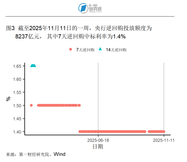 截至11月11日的一周,央行通过公开市场净回笼资金6275亿元。本周,央行逆回购投放额度为8237亿元,逆回购到期14512亿元,7天逆回购中标利率为1.4%。