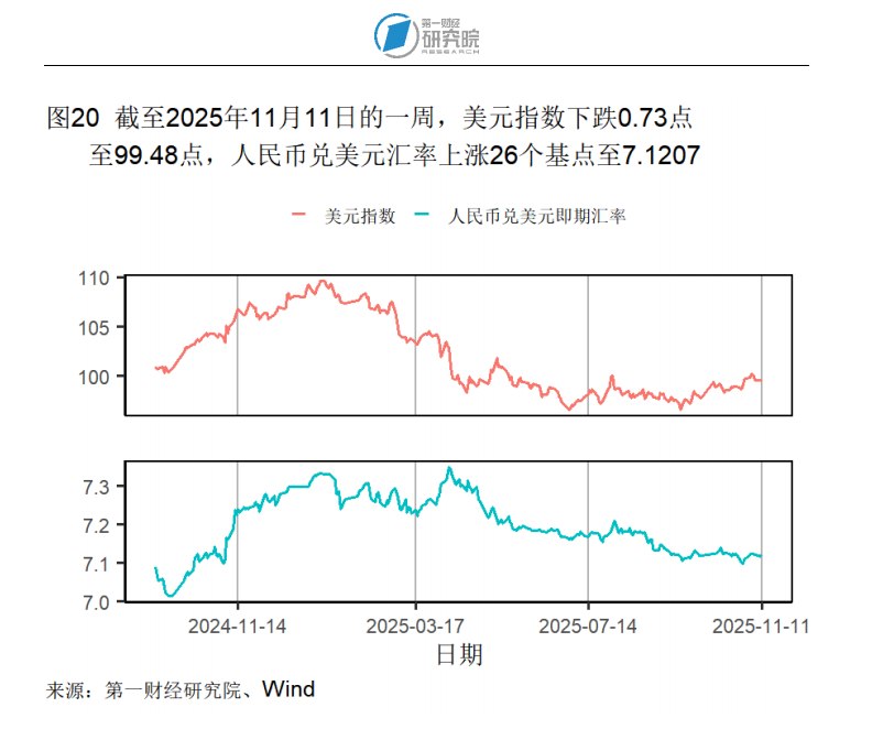 高频数据显示,截至11月11日的一周,美元指数下降0.73点至99.48点;人民币对美元汇率上升26个基点至7.1207。
