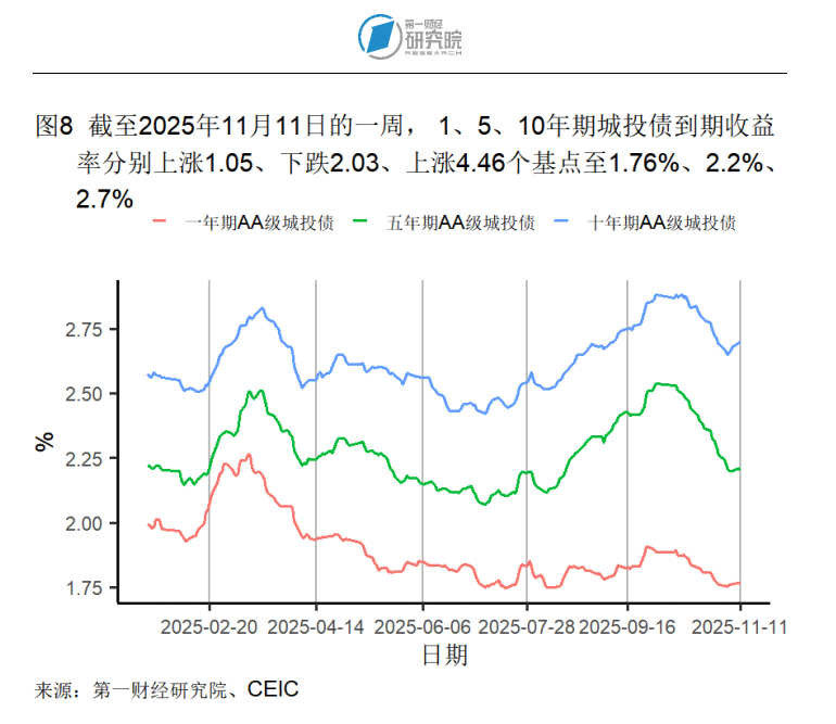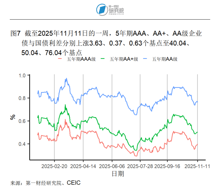 截至11月11日的1年期互换合约利率与一周前水平一致(1.54%),较一个月前下降1个基点,较去年同期下降13个基点。5年期互换合约利率也与一周前水平一致(1.59%),较一个月前下降4个基点,较去年同期下降13个基点。