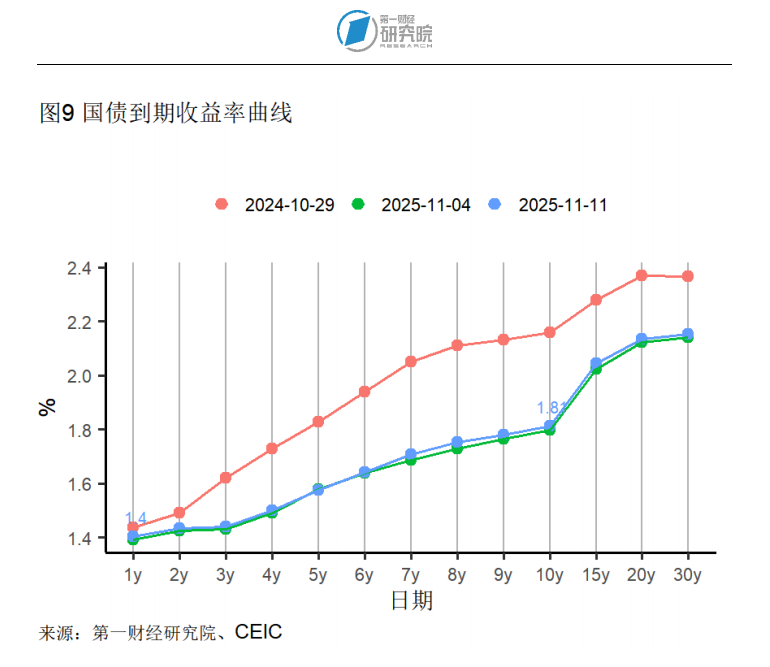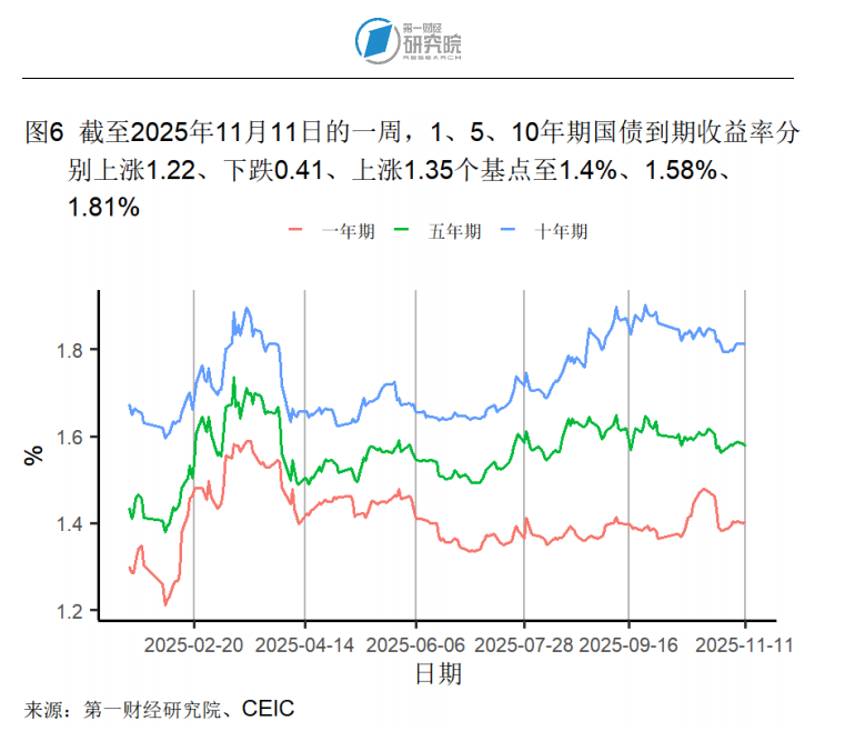截至11月11日的一周,1年期和10年期国债到期收益率分别上升1.22和1.35个基点至1.4%和1.81%;5年期国债到期收益率则下降0.41个基点至1.58%。