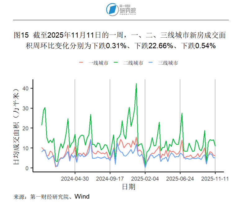 截至11月11日的一周中,新房方面,一、二、三线城市新房成交面积分别环比下降0.31%、22.66%和0.54%。二手房方面,一、二线城市与三线城市出现分化。其中,一、二线城市二手房成交面积分别环比下降4.03%和0.51%;三线城市二手房成交面积则环比上升16.93%。本周,所有房屋日均成交面积均低于去年同期水平。截至11月2日的一周,百城土地成交面积为2567.93万平方米,周环比上升29.16%。